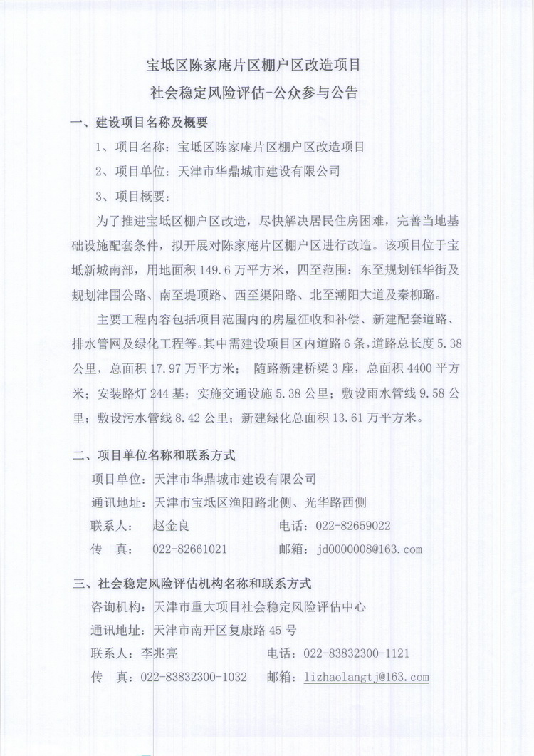 公眾參與公告:寶坻區陳家庵片區棚戶區改造社會穩定風險評估
