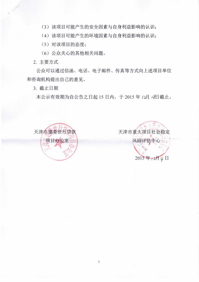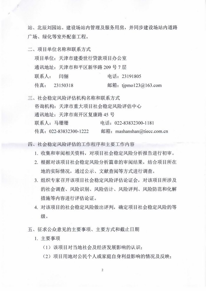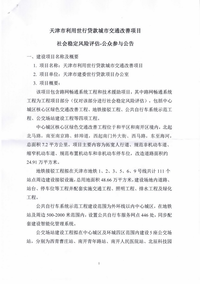 公眾參與公告:天津市利用世行貸款城市交通改善項目社會穩(wěn)定風險評估