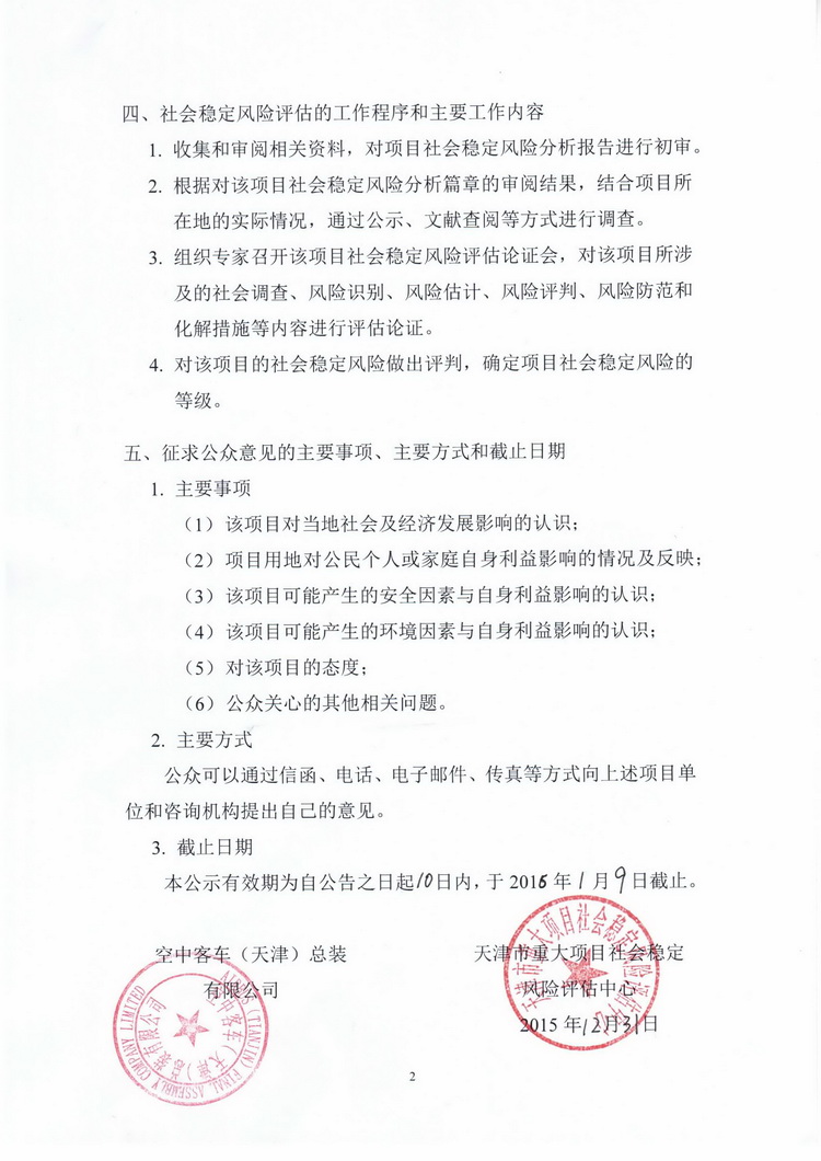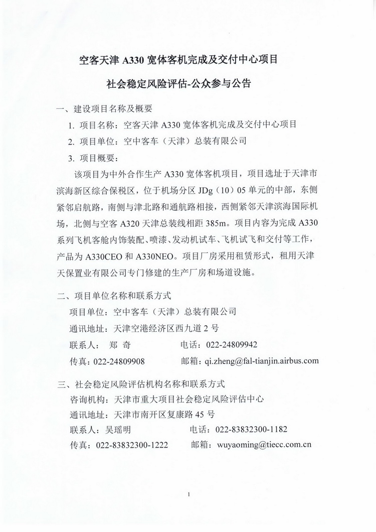 公眾參與公告:空客天津A330寬體客機完成及交付中心項目社會穩定風險評估