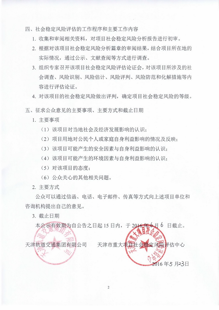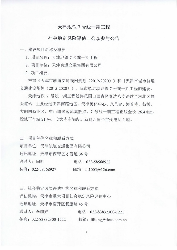 公眾參與公告:天津地鐵7號線一期工程社會穩定風險評估