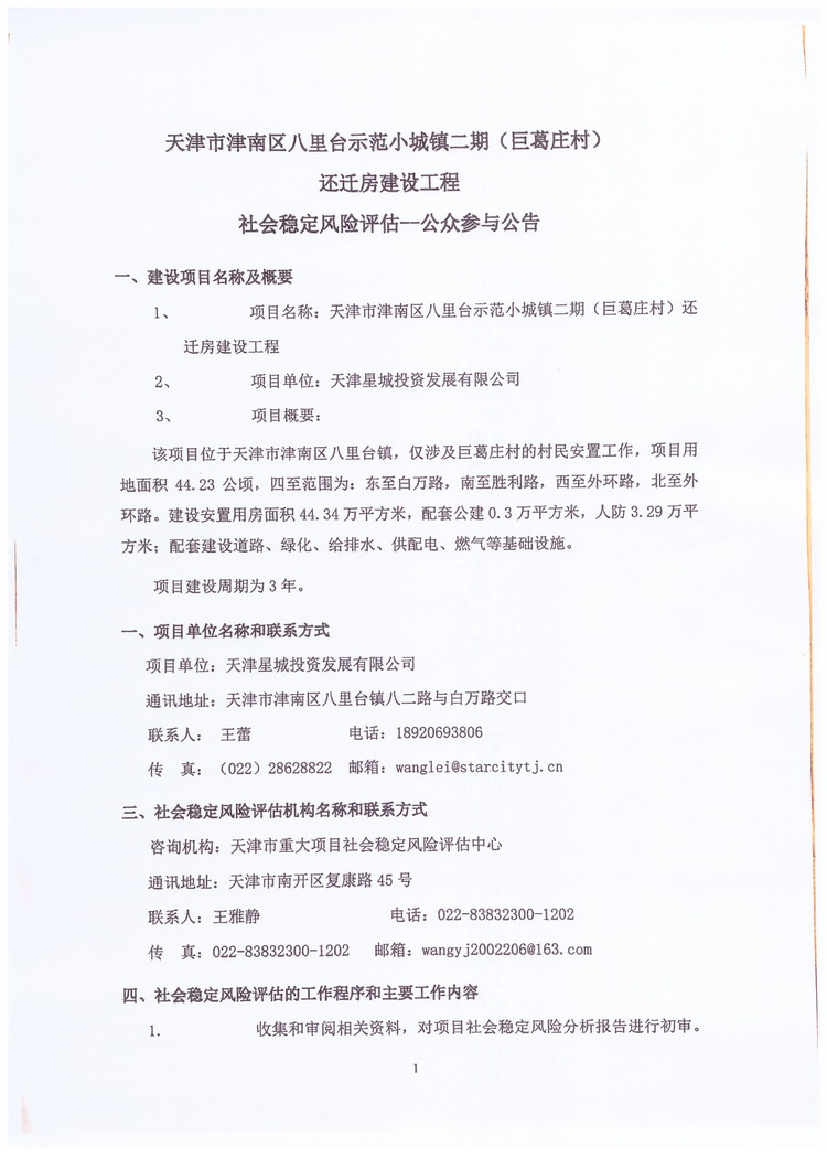 公眾參與公告:天津市津南八里臺示范小城鎮(zhèn)二期(巨葛莊村)還遷房建設(shè)工程穩(wěn)評