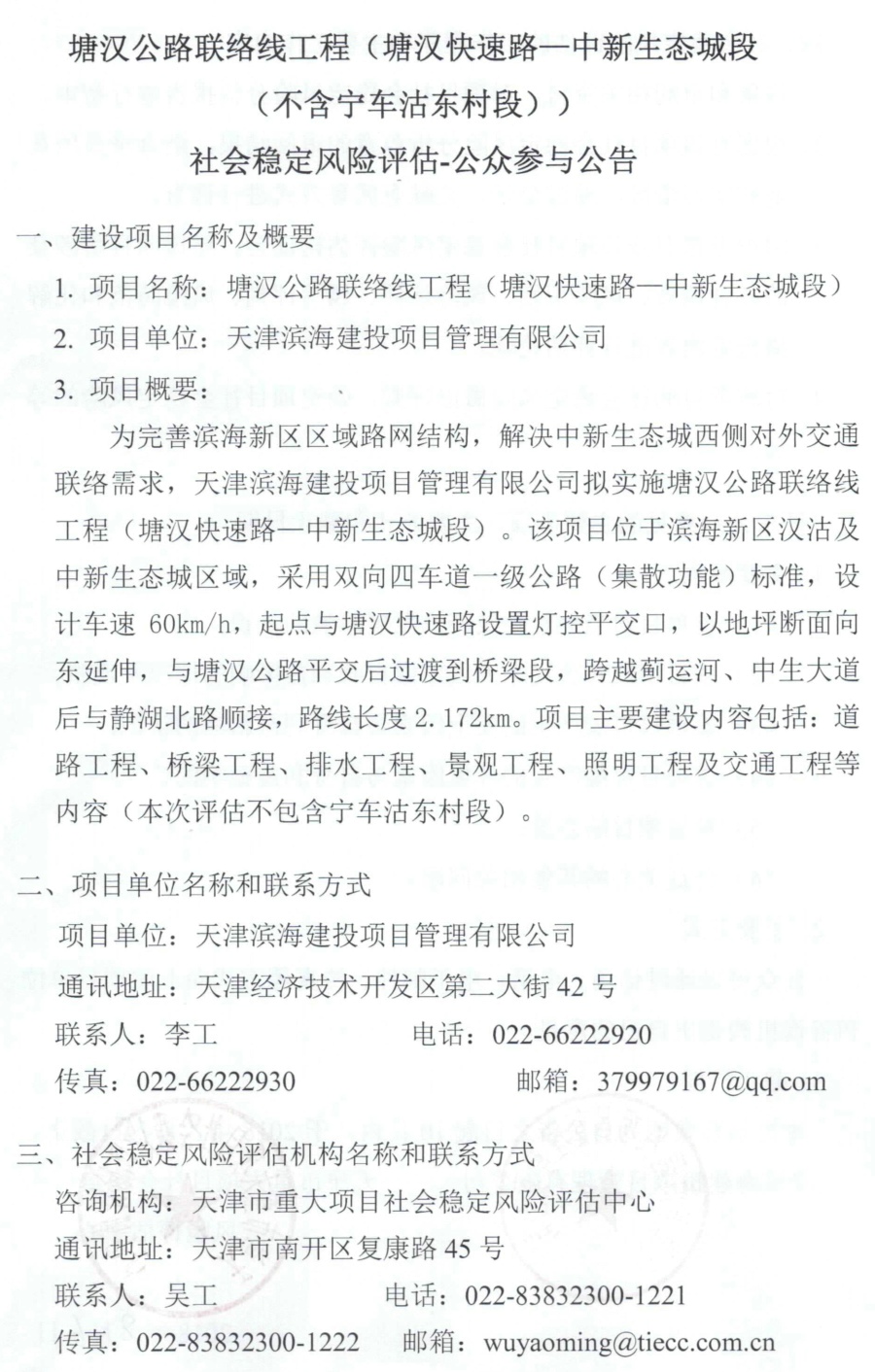公眾參與公告:塘漢公路聯絡線工程(塘漢快速路—中新生態城段)社會穩定風險評估