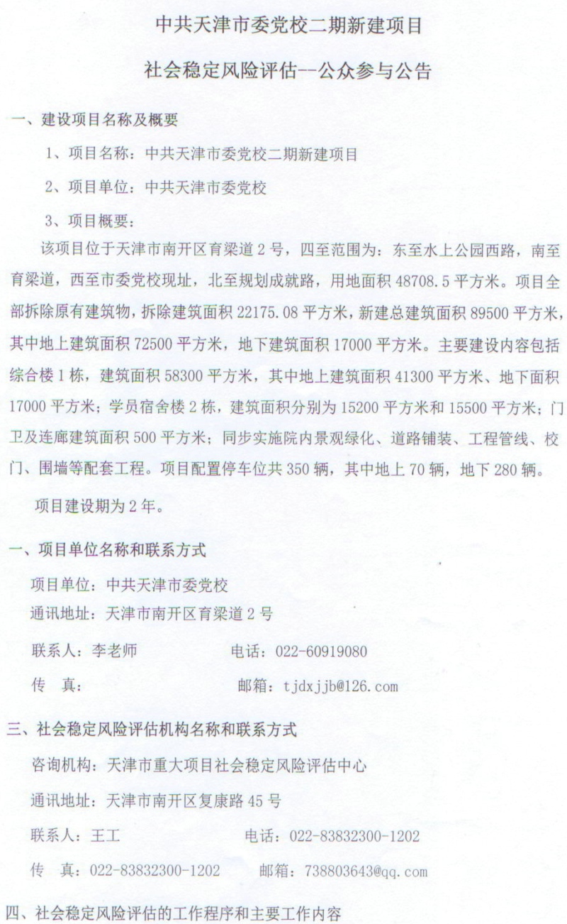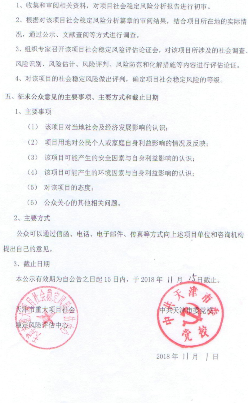 公眾參與公告:中共天津市委黨校二期新建項目社會穩定風險評估