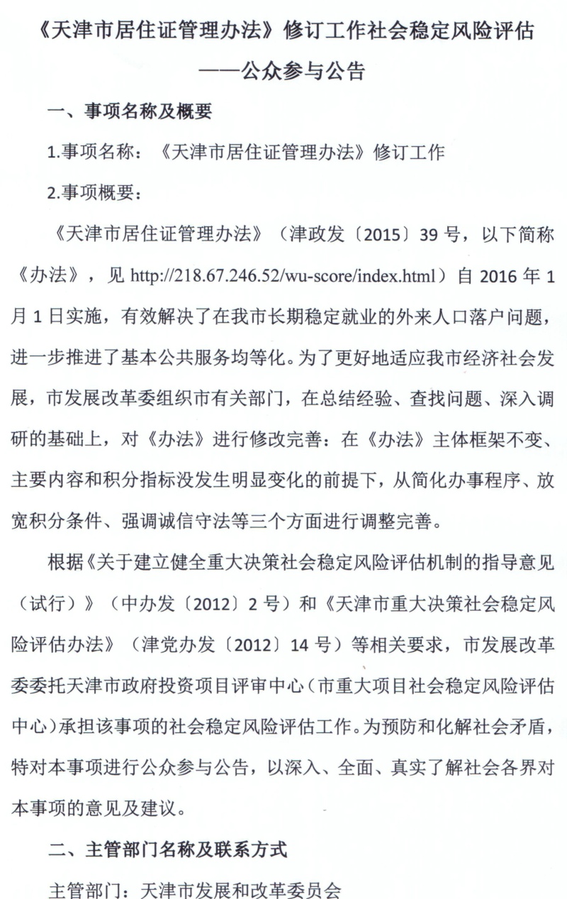 公眾參與公告:《天津市居住證管理辦法》修訂工作社會穩定風險評估