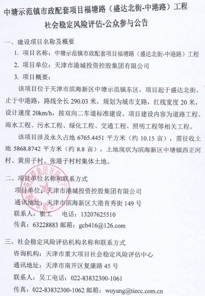 公眾參與公告:中塘示范鎮市政配套項目福塘路(盛達北街-中港路)工程社會穩定風險評估