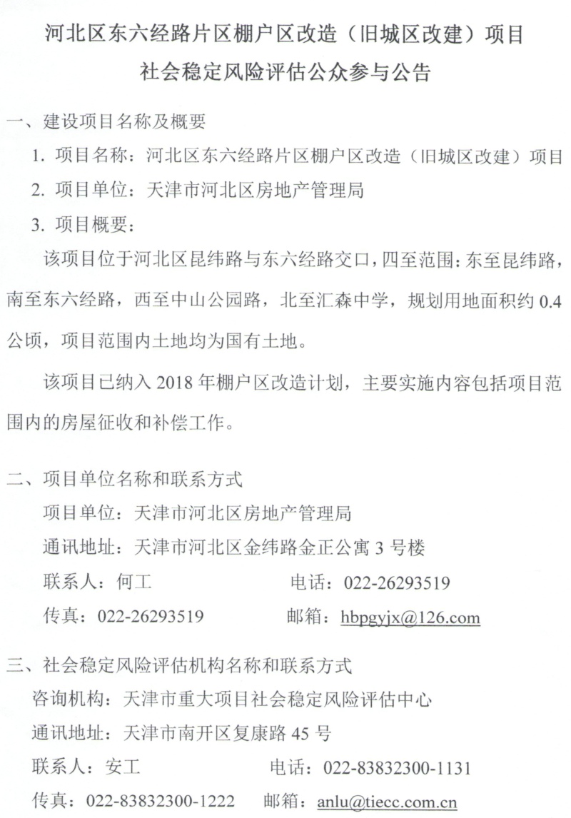 公眾參與公告:河北區東六經路片區棚戶區改造(舊城區改建)項目社會穩定風險評估