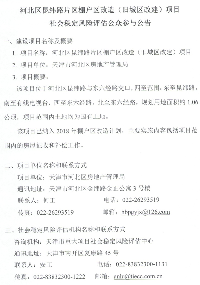 公眾參與公告:河北區昆緯路片區棚戶區改造(舊城區改建)項目社會穩定風險評估
