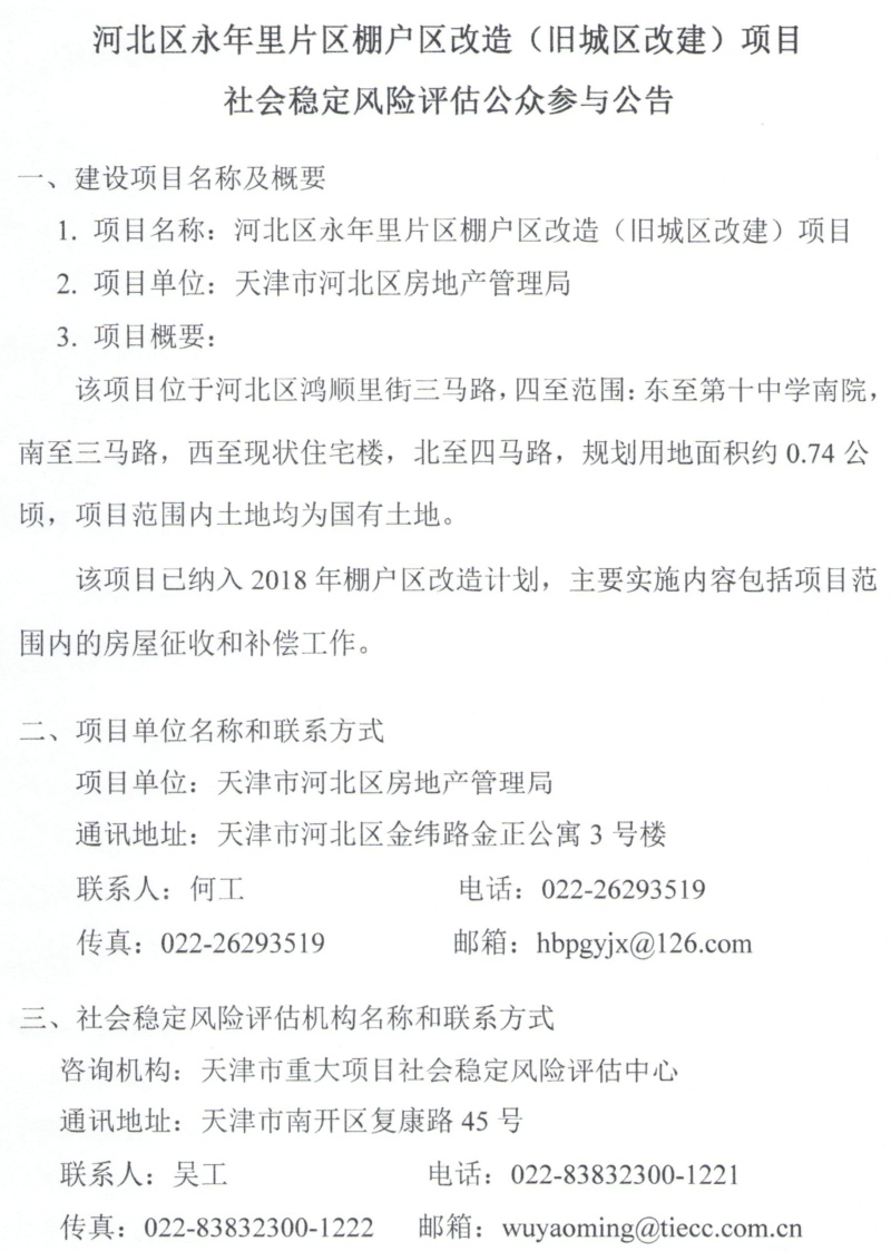 公眾參與公告:河北區永年里片區棚戶區改造(舊城區改建)項目社會穩定風險評估
