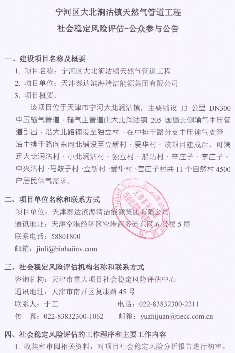 公眾參與公告:寧河區大北澗沽鎮天然氣管道工程社會穩定風險評估