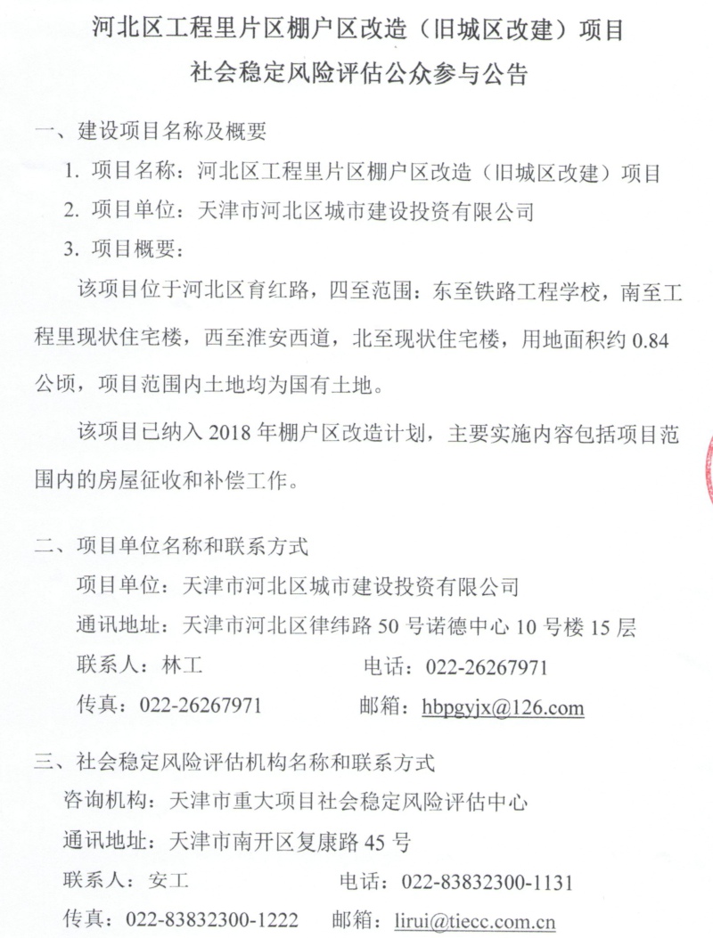 公眾參與公告:河北區工程里片區棚戶區改造(舊城區改建)項目社會穩定風險評估