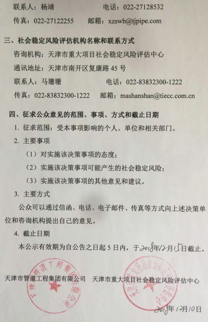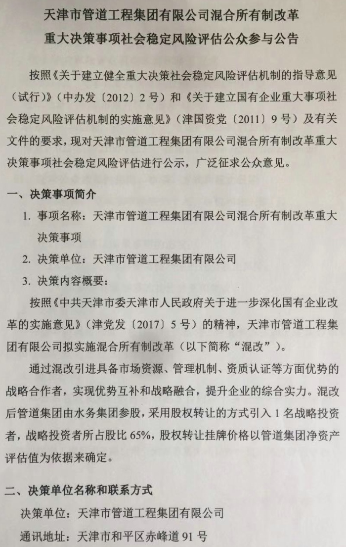 公眾參與公告:天津市管道工程集團有限公司混合所有制改革重大決策事項社穩評估