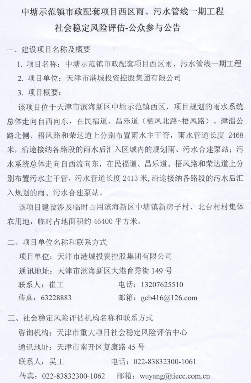 公眾參與公告:中塘示范鎮(zhèn)市政配套項(xiàng)目西區(qū)雨、污水管線一期工程社會(huì)穩(wěn)定風(fēng)險(xiǎn)評(píng)估