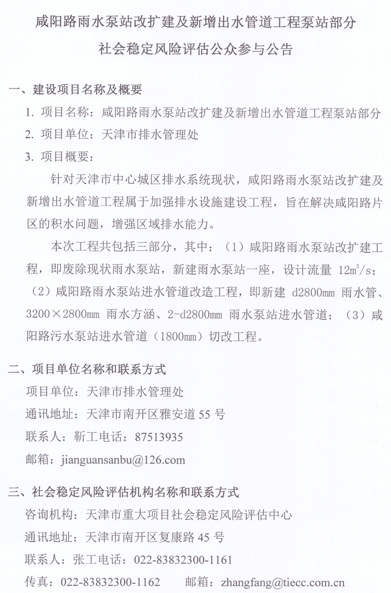 公眾參與公告:咸陽路雨水泵站改擴建及新增出水管道工程泵站部分社會穩定風險評估