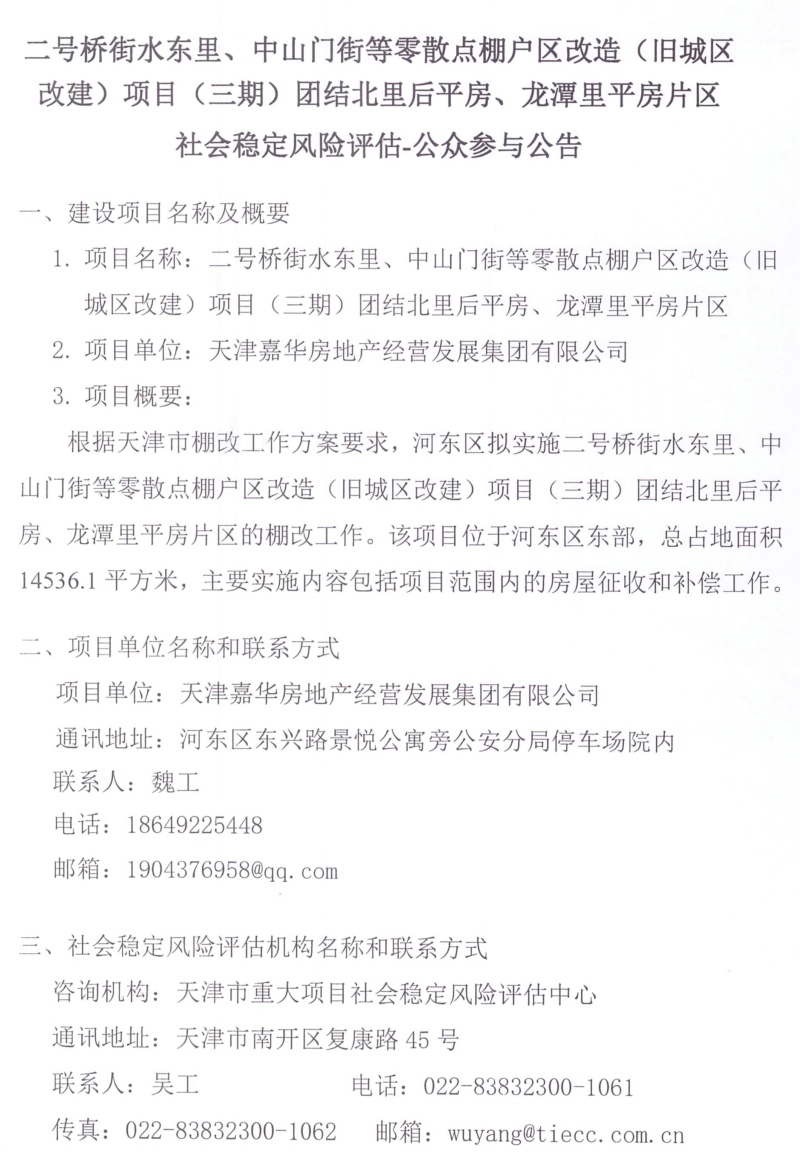 公眾參與公告:二號橋街水東里、中山門街等零散點棚戶區改造(舊城區改建)項目(三期)團結北里后平房、龍潭里平房片區社會穩定風險評估