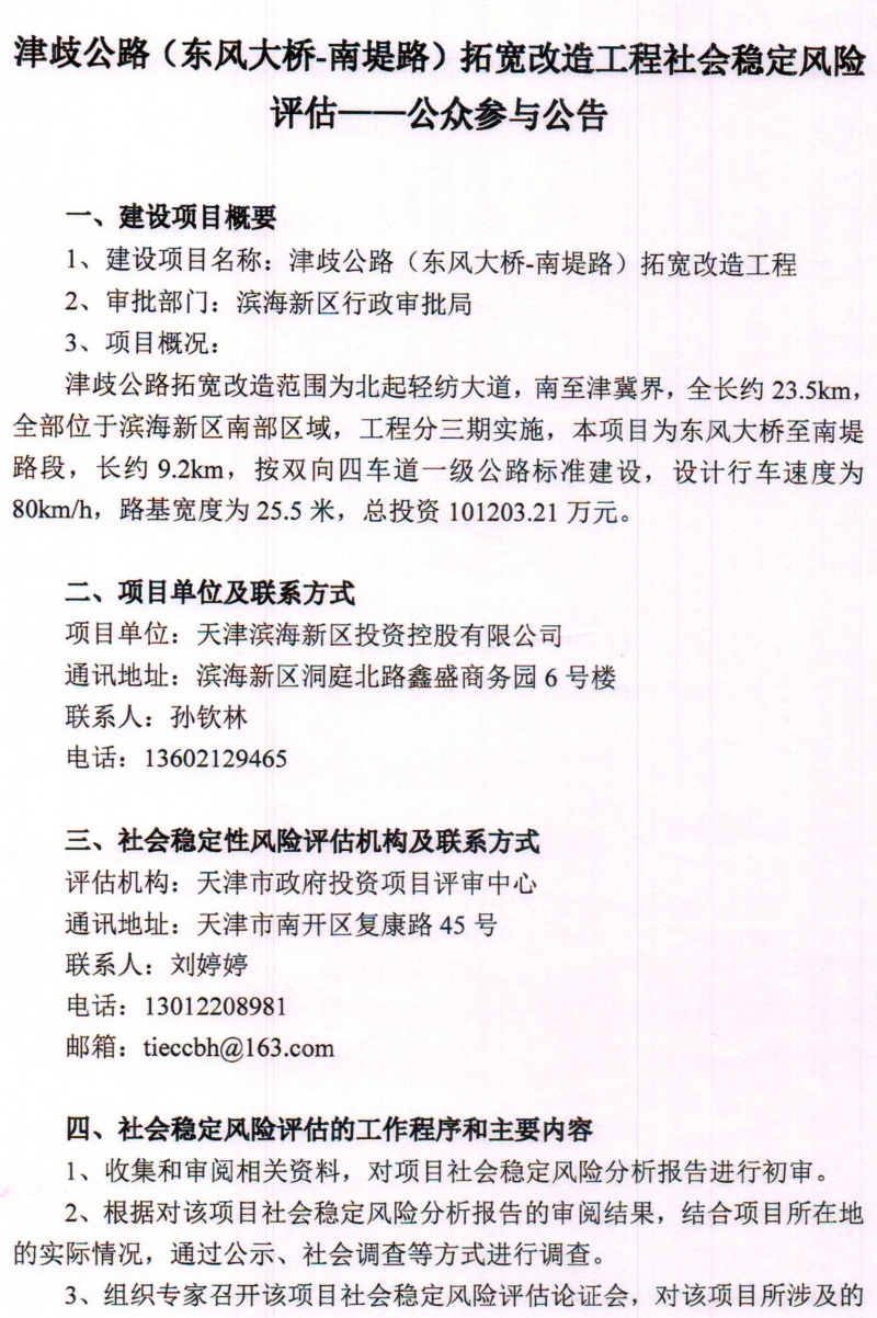 公眾參與公告:津歧公路(東風大橋-南堤路)拓寬改造工程社會穩(wěn)定風險評估