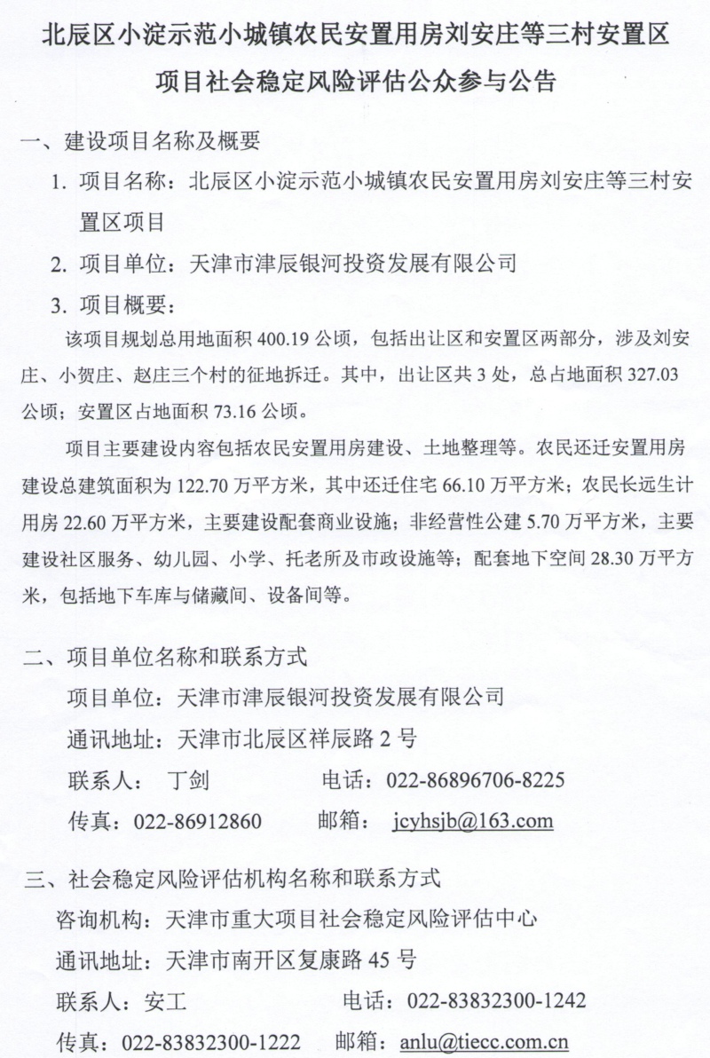 公眾參與公告:北辰區小淀示范小城鎮農民安置用房劉安莊等三村安置區項目社會穩定風險評估