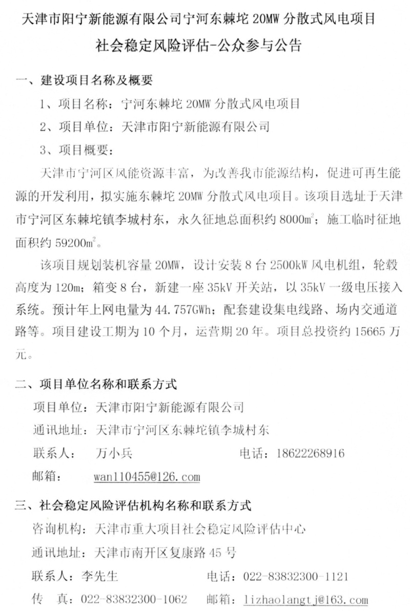 公眾參與公告:天津市陽寧新能源有限公司寧河東棘坨20MW分散式風電項目社會穩定風險評估