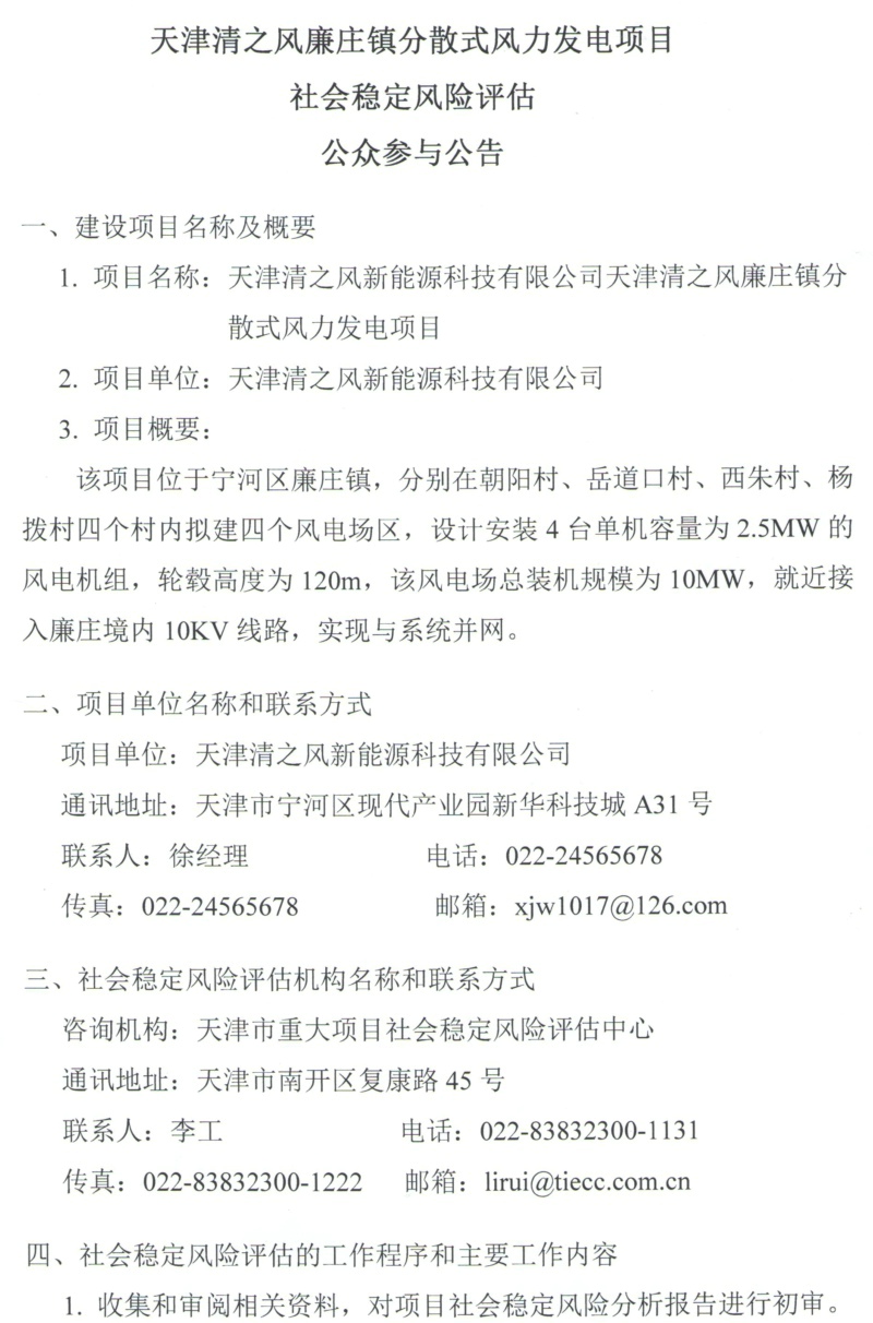 公眾參與公告:天津清之風(fēng)廉莊鎮(zhèn)分散式風(fēng)力發(fā)電項(xiàng)目社會(huì)穩(wěn)定風(fēng)險(xiǎn)評(píng)估