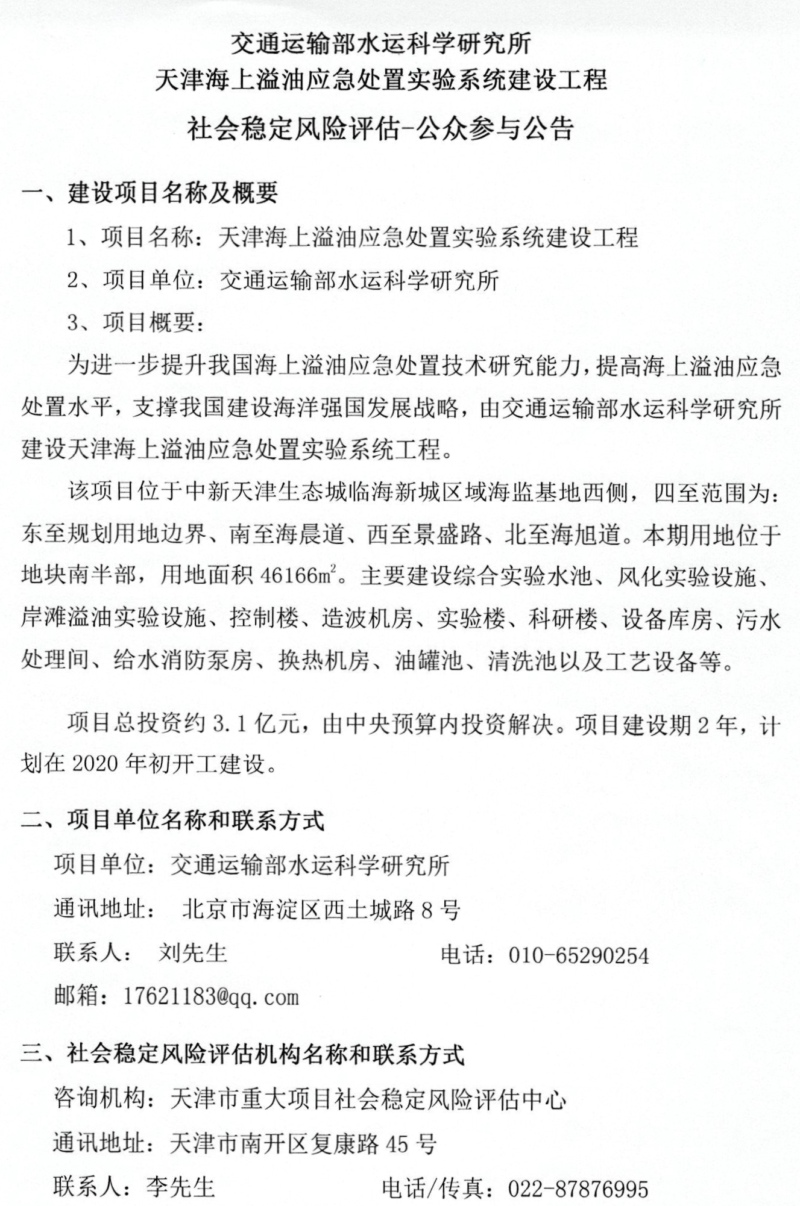 公眾參與公告:交通運輸部水運科學研究所天津海上溢油應急處置實驗系統建設工程社會穩定風險評估