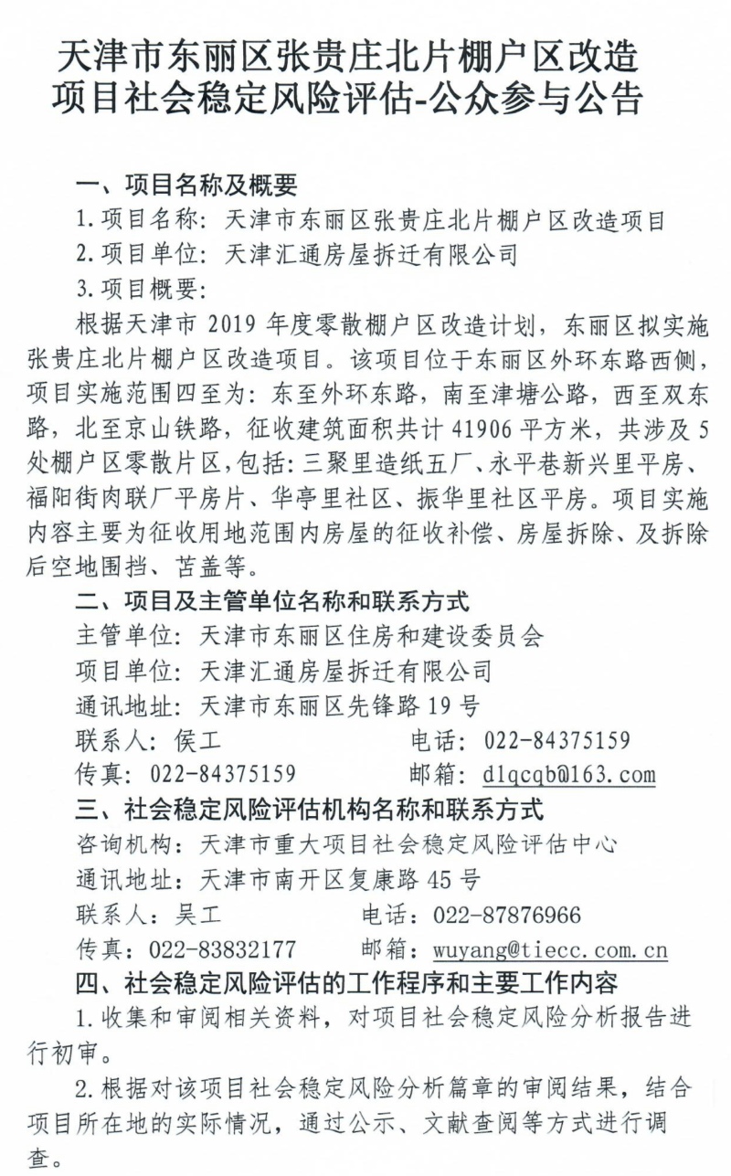 公眾參與公告:天津市東麗區(qū)張貴莊北片棚戶區(qū)改造項(xiàng)目社會(huì)穩(wěn)定風(fēng)險(xiǎn)評(píng)估