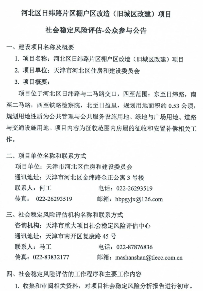 公眾參與公告:河北區日緯路片區棚戶區改造(舊城區改建)項目社會穩定風險評估
