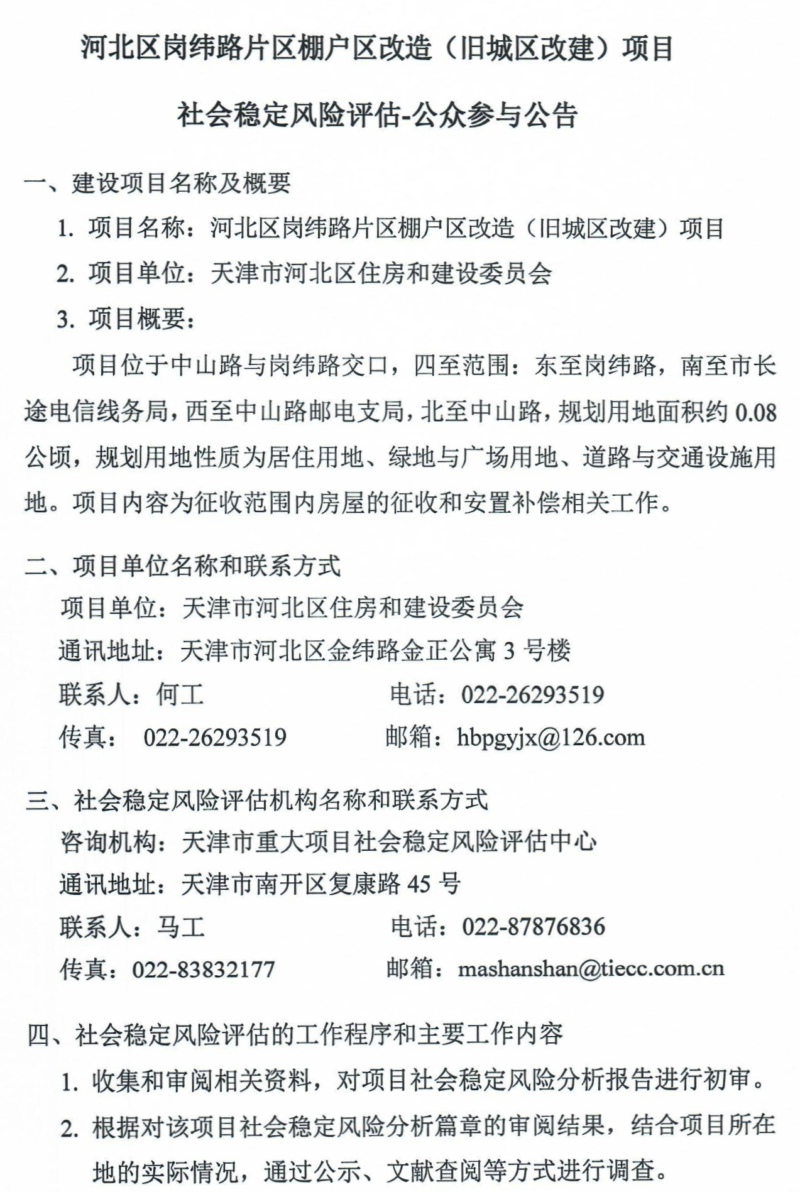 公眾參與公告:河北區(qū)崗緯路片區(qū)棚戶區(qū)改造(舊城區(qū)改建)項目社會穩(wěn)定風險評估