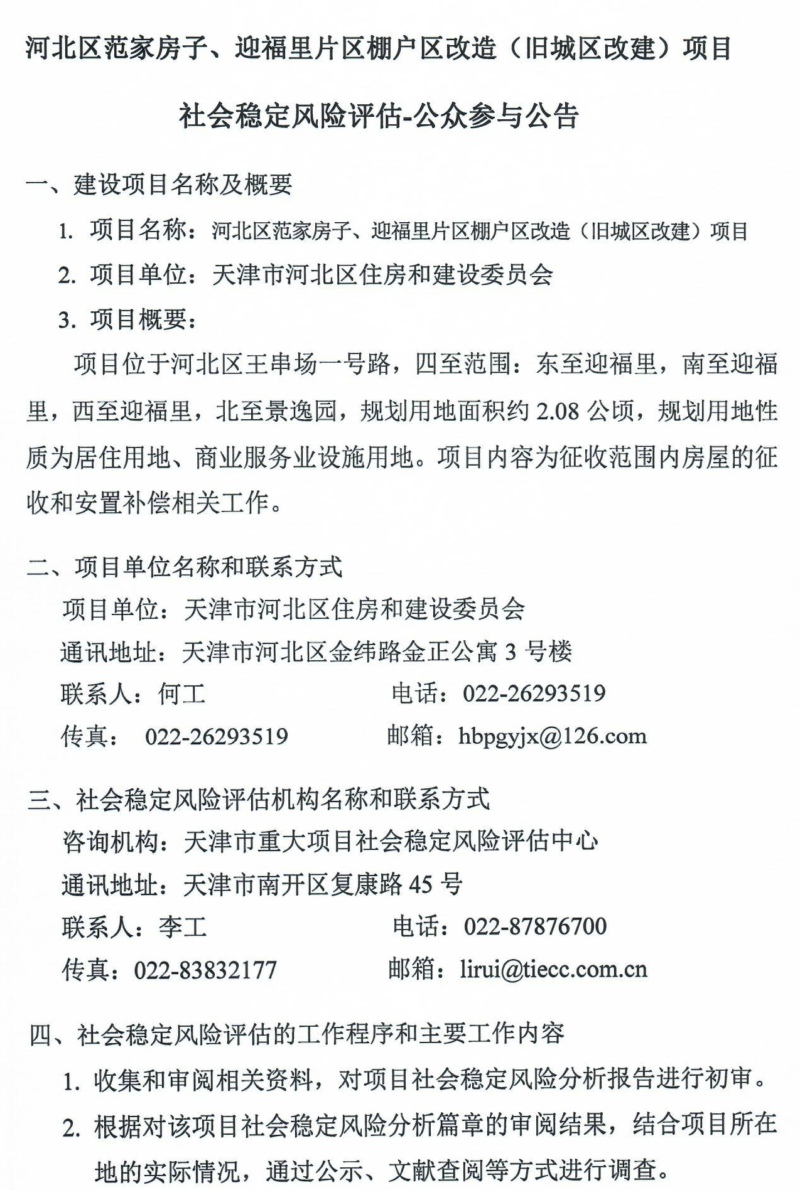 公眾參與公告:河北區范家房子、迎福里片區棚戶區改造(舊城區改建)項目社會穩定風險評估