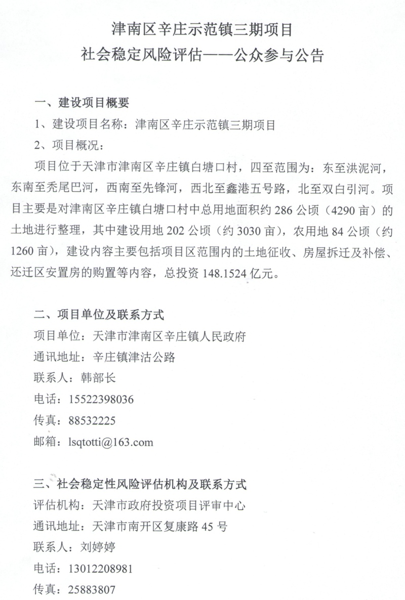 公眾參與公告:津南區辛莊示范鎮三期項目社會穩定風險評估