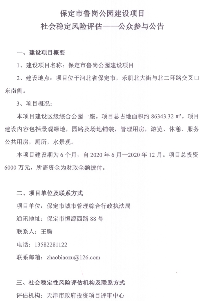 公眾參與公告:保定市魯崗公園建設(shè)項(xiàng)目社會(huì)穩(wěn)定風(fēng)險(xiǎn)評(píng)估