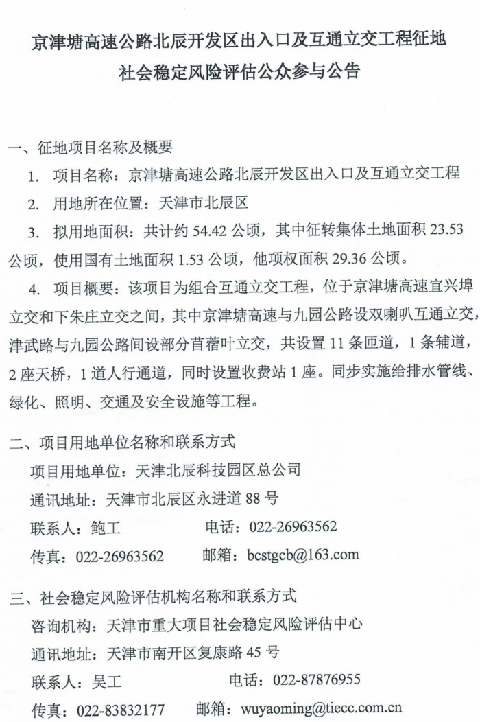 公眾參與公告:京津塘高速公路北辰開發(fā)區(qū)出入口及互通立交工程征地社會穩(wěn)定風(fēng)險(xiǎn)評估