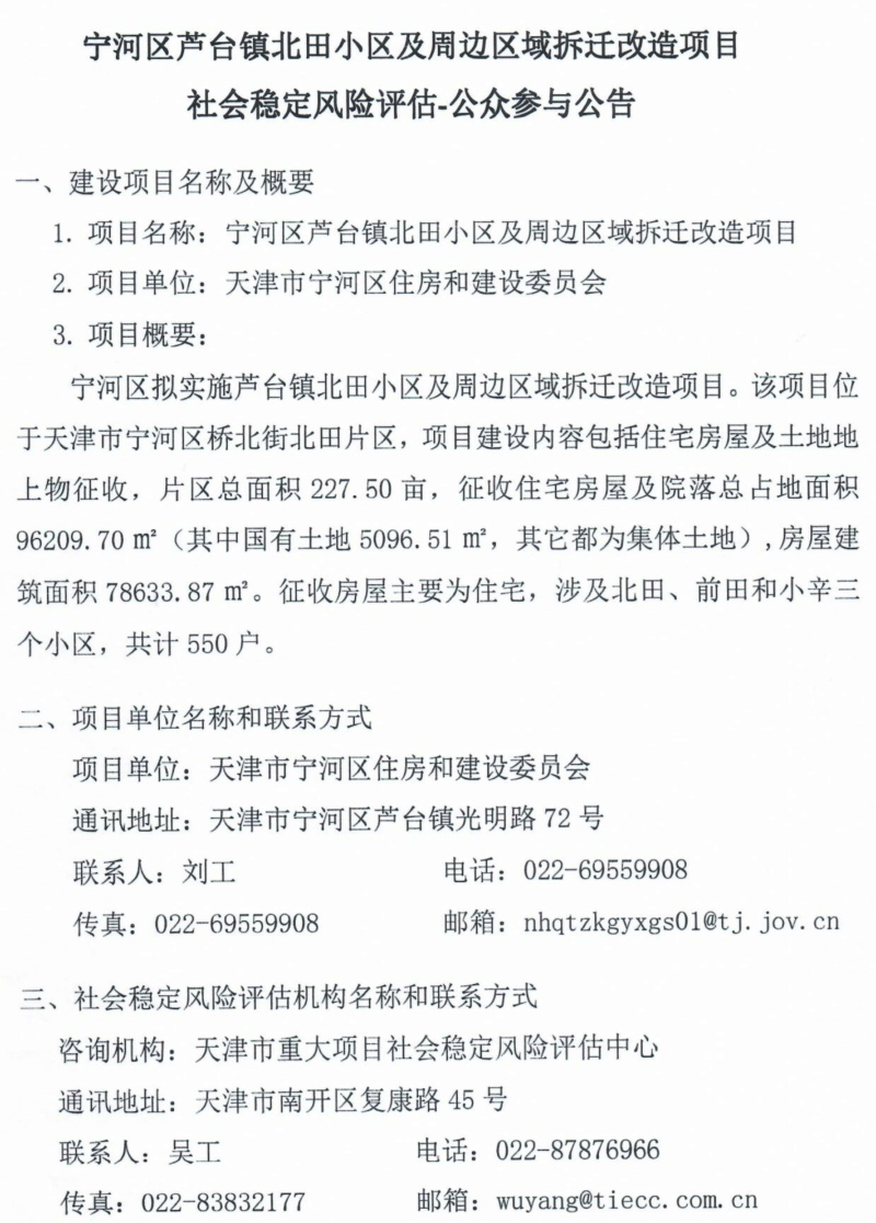 公眾參與公告:寧河區蘆臺鎮北田小區及周邊區域拆遷改造項目社會穩定風險評估