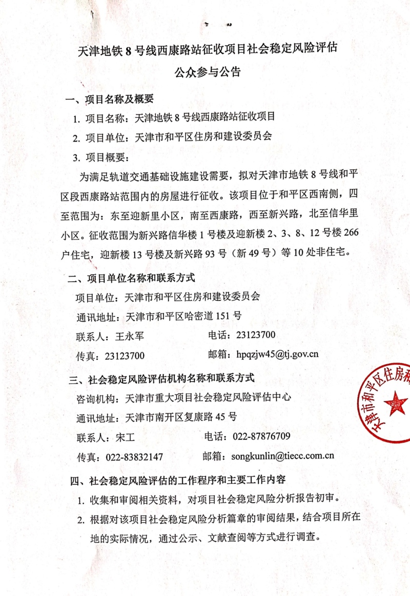 公眾參與公告:天津地鐵8號線西康路站征收項目社會穩定風險評估