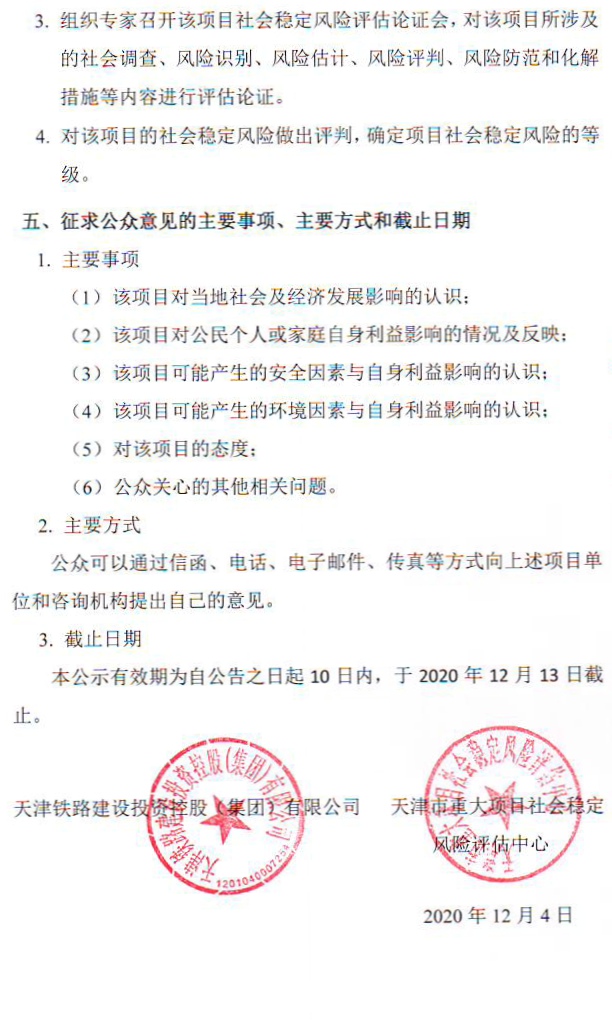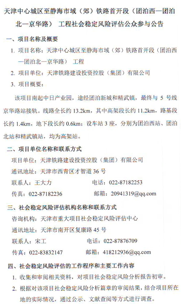 公眾參與公告:天津中心城區至靜海市域(郊)鐵路首開段(團泊西—團泊北—京華路)工程社會穩定風險評估