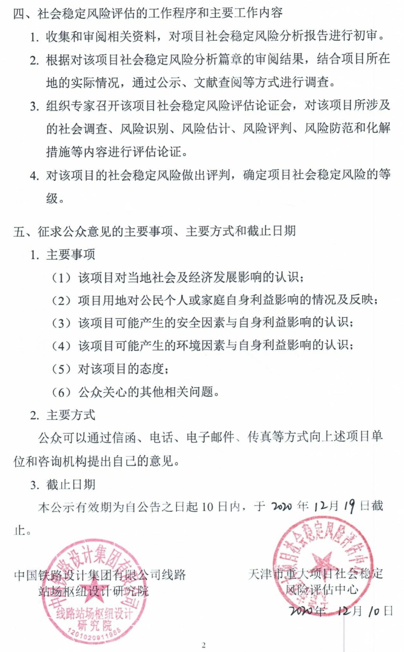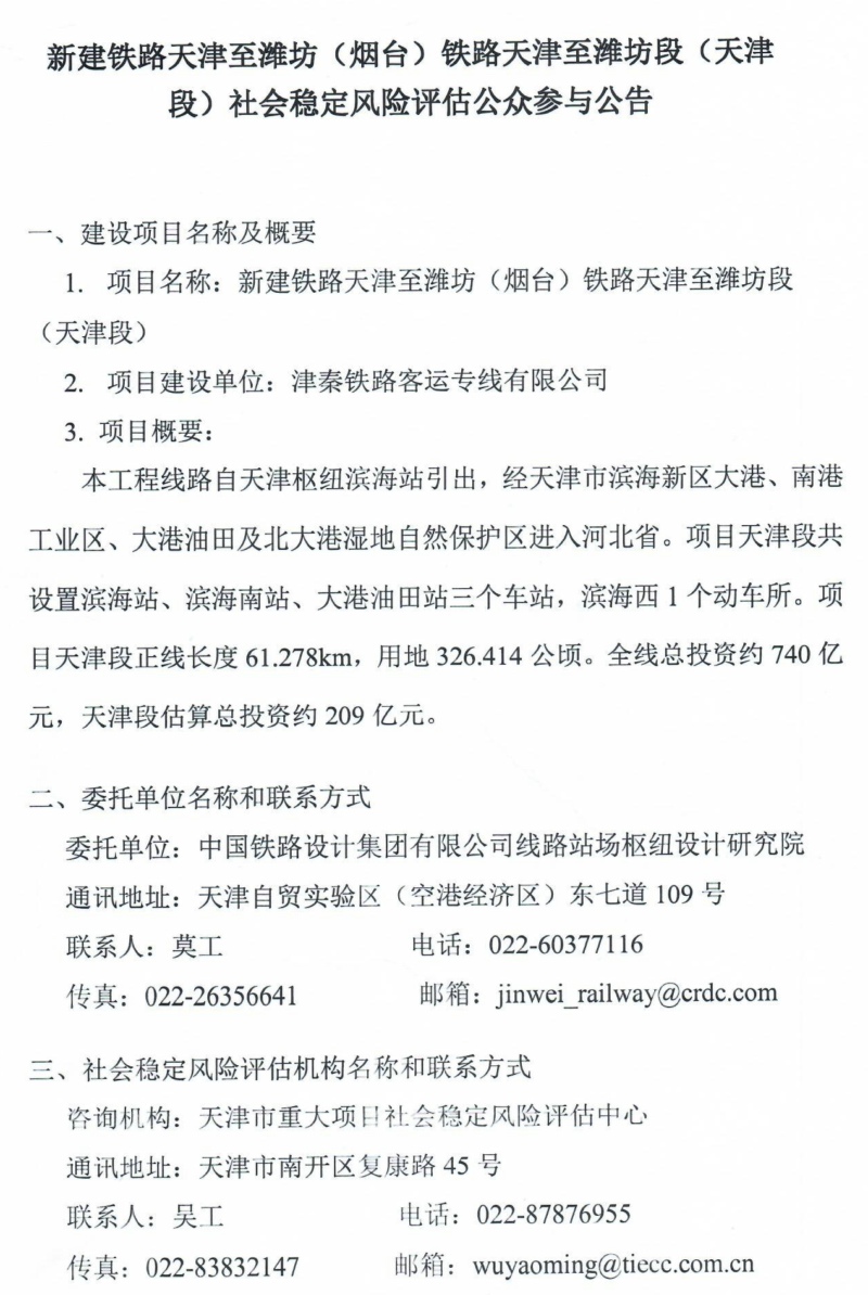 公眾參與公告:新建鐵路天津至濰坊(煙臺)鐵路天津至濰坊段(天津段)社會穩定風險評估