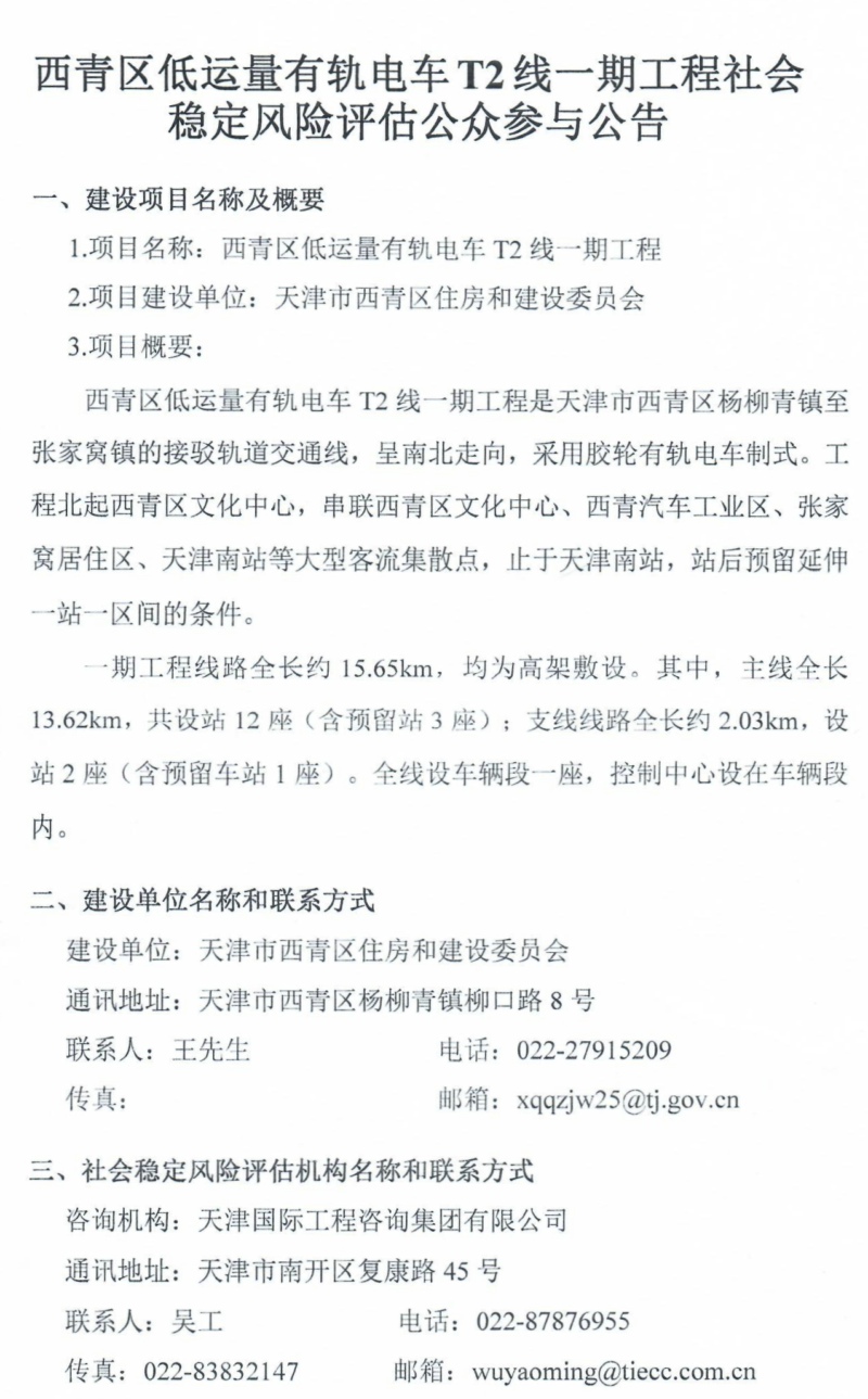 公眾參與公告:西青區低運量有軌電車T2線一期工程社會穩定風險評估