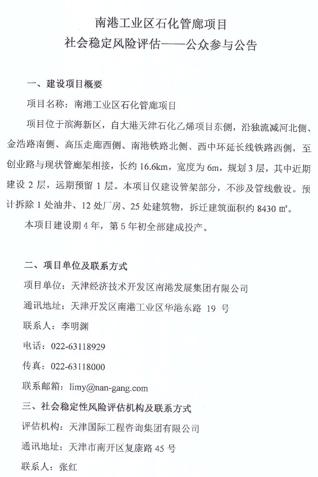 公眾參與公告:南港工業區石化管廊項目社會穩定風險評估
