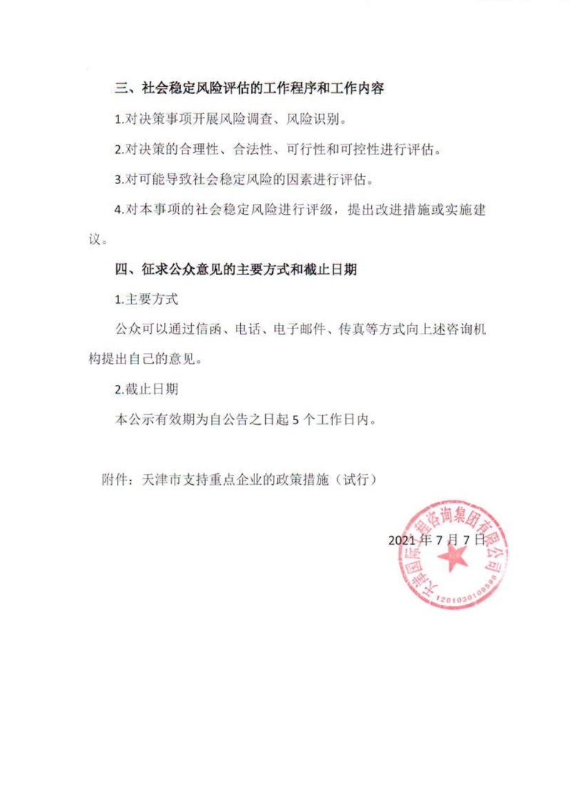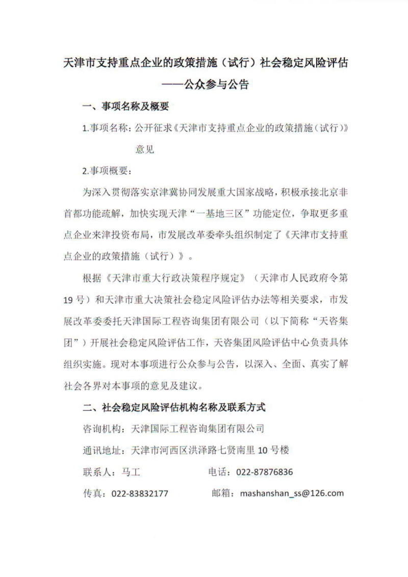 公眾參與公告:天津市支持重點企業的政策措施(試行)社會穩定風險評估