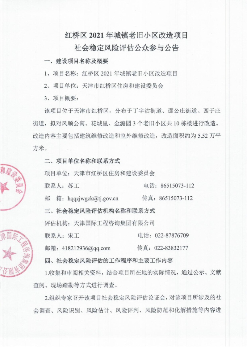 公眾參與公告:紅橋區2021年城鎮老舊小區改造項目社會穩定風險評估