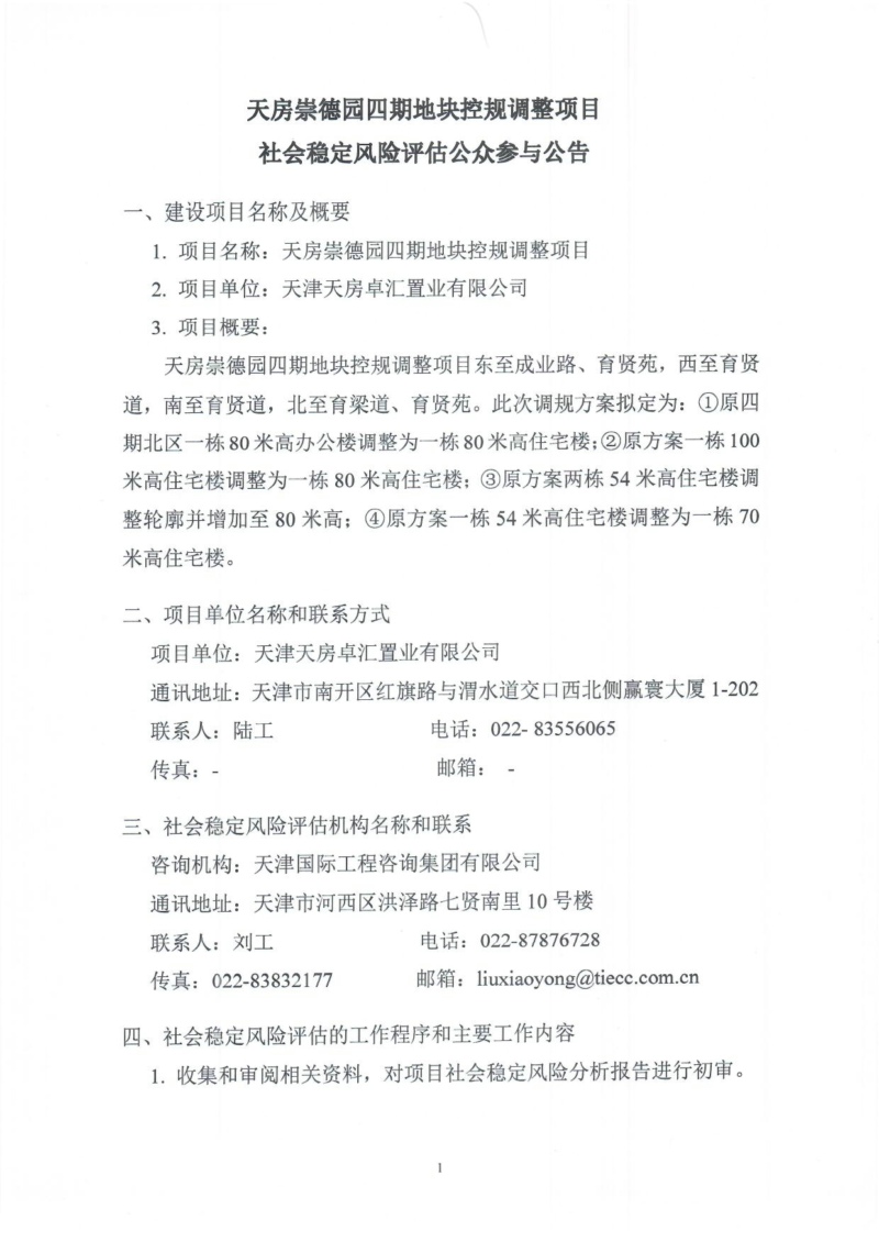 公眾參與公告:天房崇德園四期地塊控規調整項目社會穩定風險評估