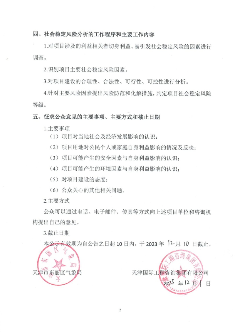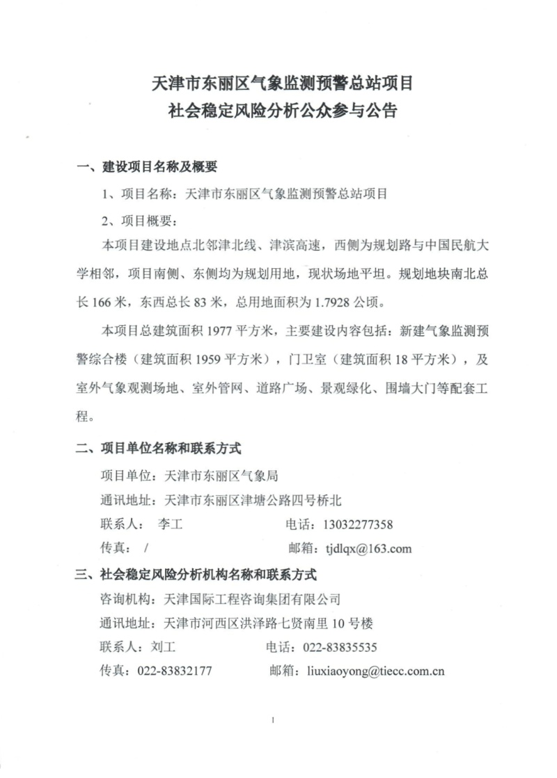 公眾參與公告:天津市東麗區(qū)氣象監(jiān)測預警總站項目社會穩(wěn)定風險分析