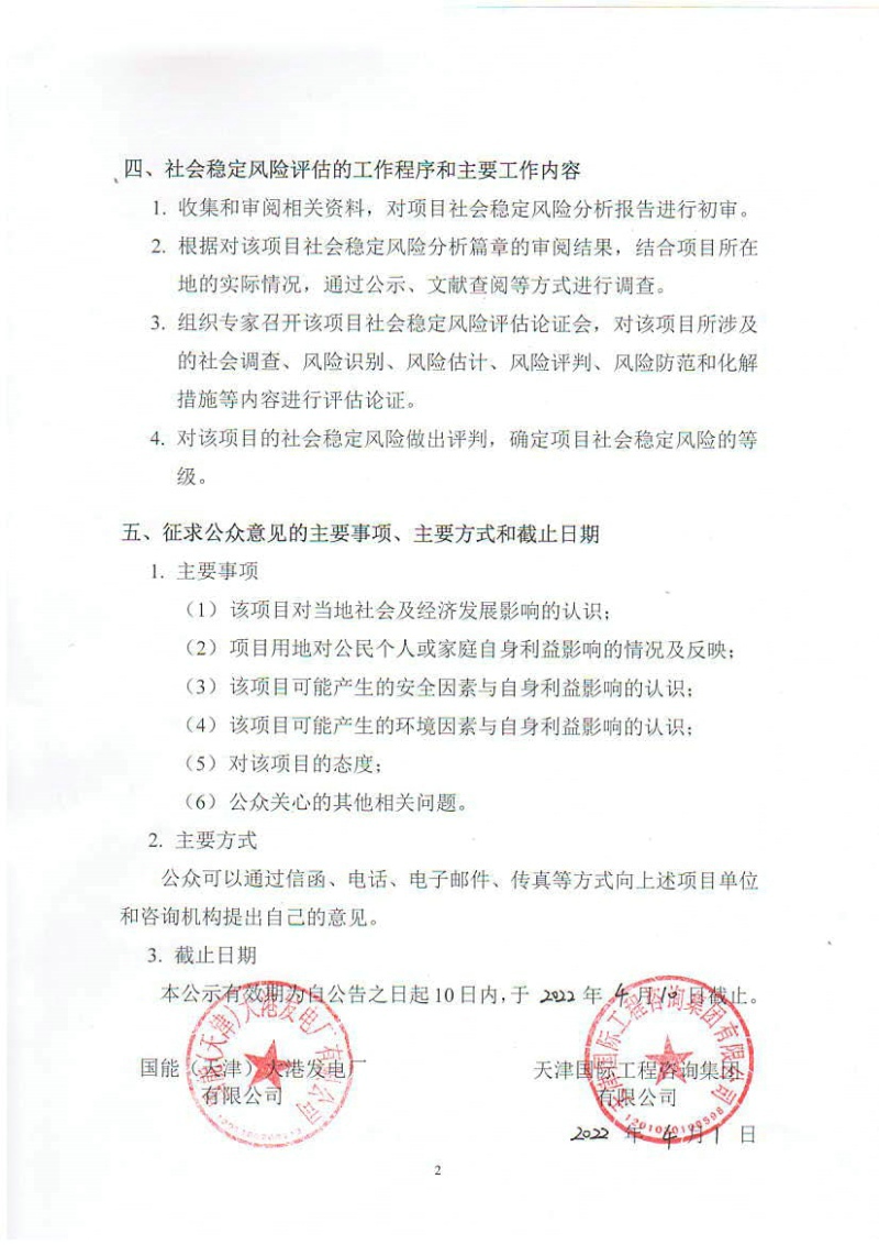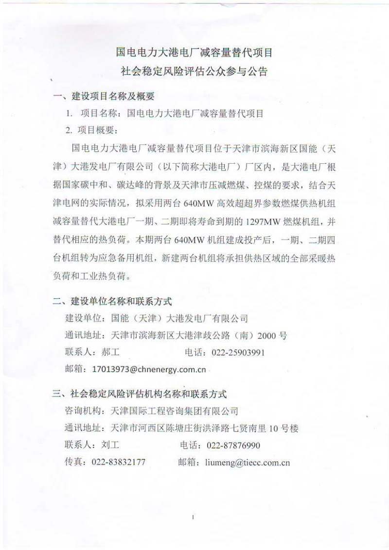 公眾參與公告:國電電力大港電廠減容量替代項目社會穩定風險評估