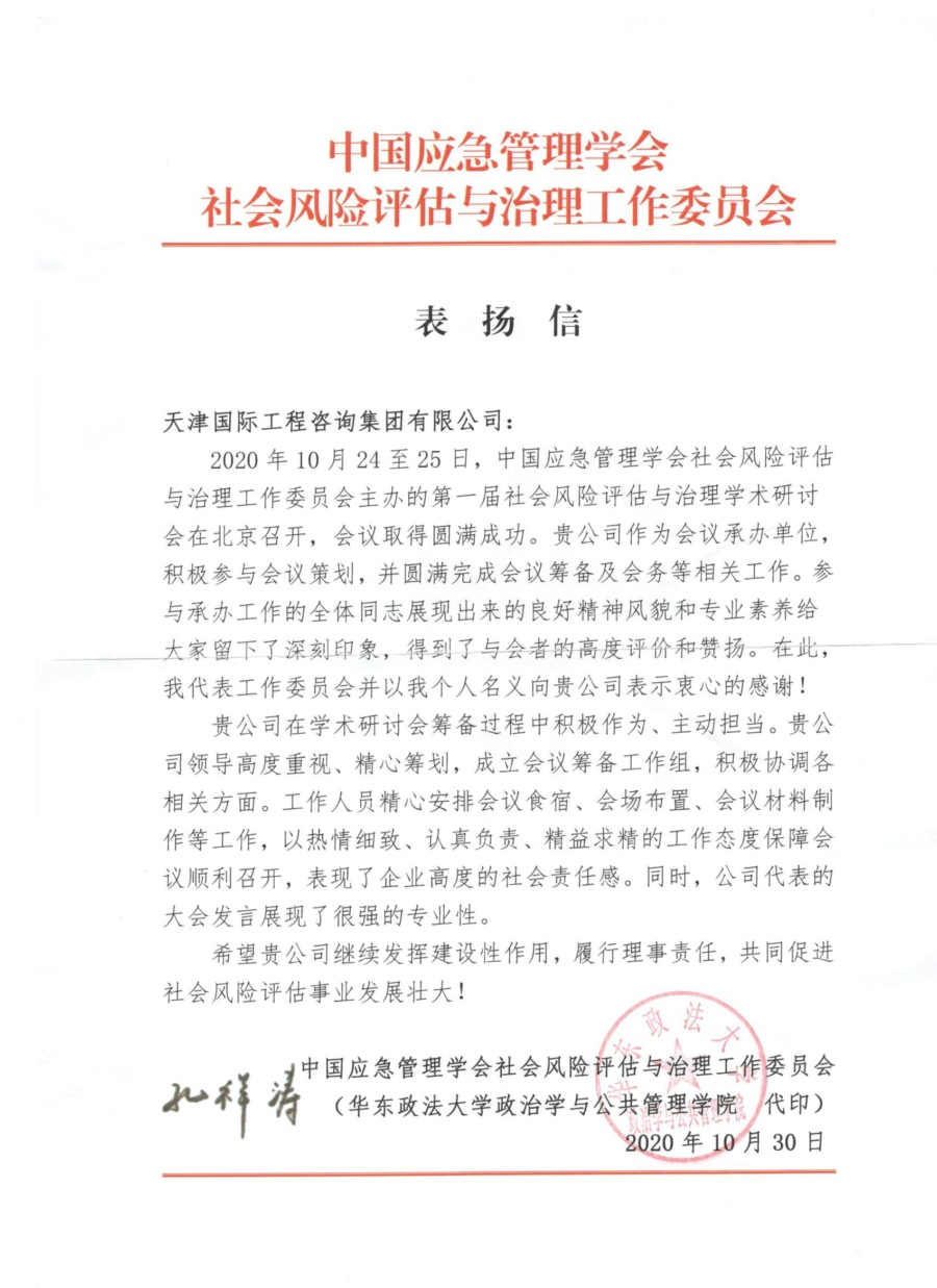 作為副主任委員單位和會議承辦單位,天咨集團從社會風險評估與治理工作委員會籌備組建之初,就參與了頂層設計和具體實施等大量工作。承辦此次研討會得到了集團領導的大力支持,大會成功舉辦得到了與會人員的充分肯定。大會閉幕式上,中國應急管理學會常務理事孔祥濤對天咨集團及其他協辦單位表示感謝,特別對天咨集團人員勤勉敬業、精益求精的工作態度給予了高度評價。會后中國應急管理學會社會風險評估與治理工作委員會特此發送表揚信,對集團所做的工作表示感謝,并希望集團繼續發揮作用,共同促進社會風險評估事業發展壯大。
