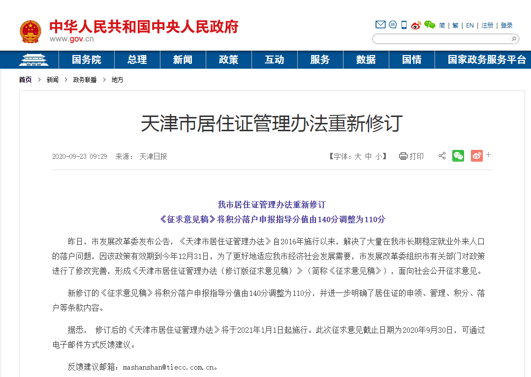 《天津市居住證管理辦法(修訂版征求意見稿)》公開征求意見