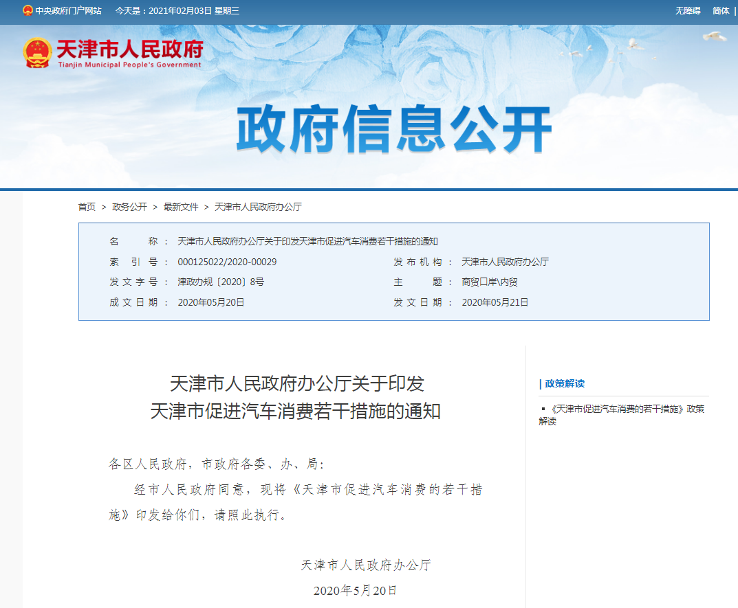 《天津市促進(jìn)汽車消費(fèi)的若干措施》正式發(fā)布