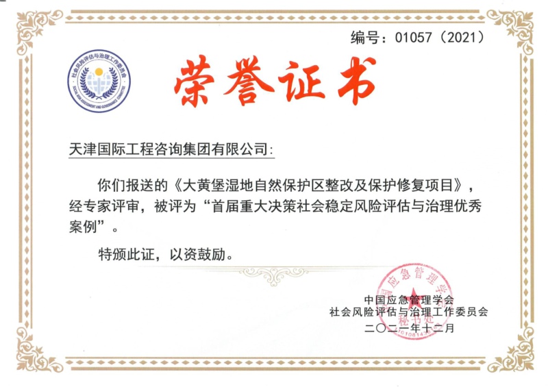 大黃堡濕地自然保護(hù)區(qū)整改及保護(hù)修復(fù)項目獲獎證書