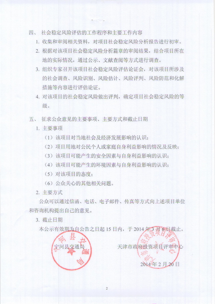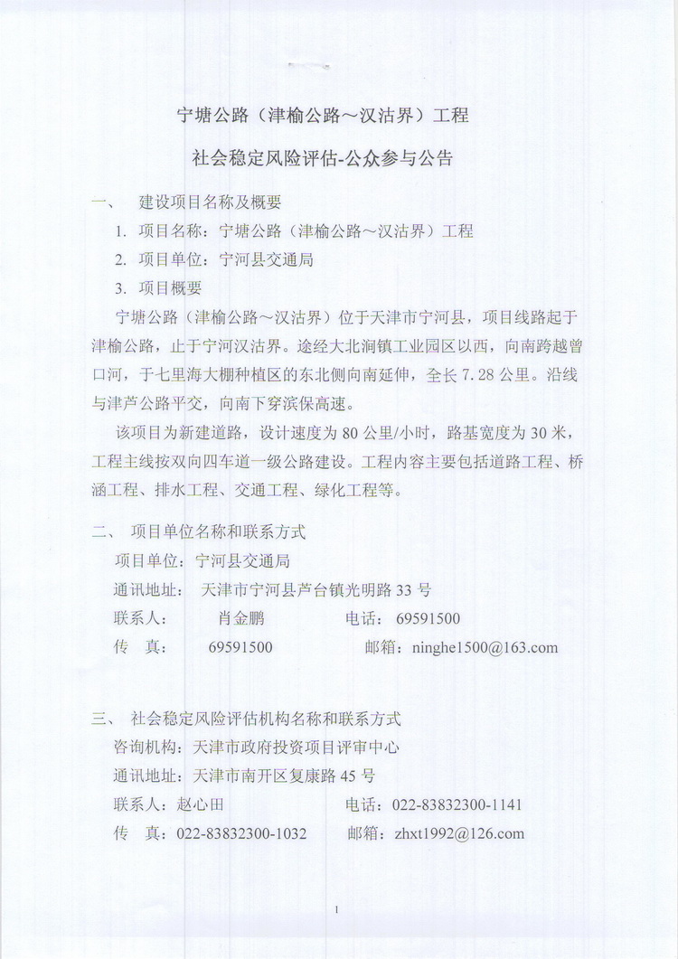 公眾參與公告:寧塘公路(津榆公路~漢沽界)工程社會穩定風險評估