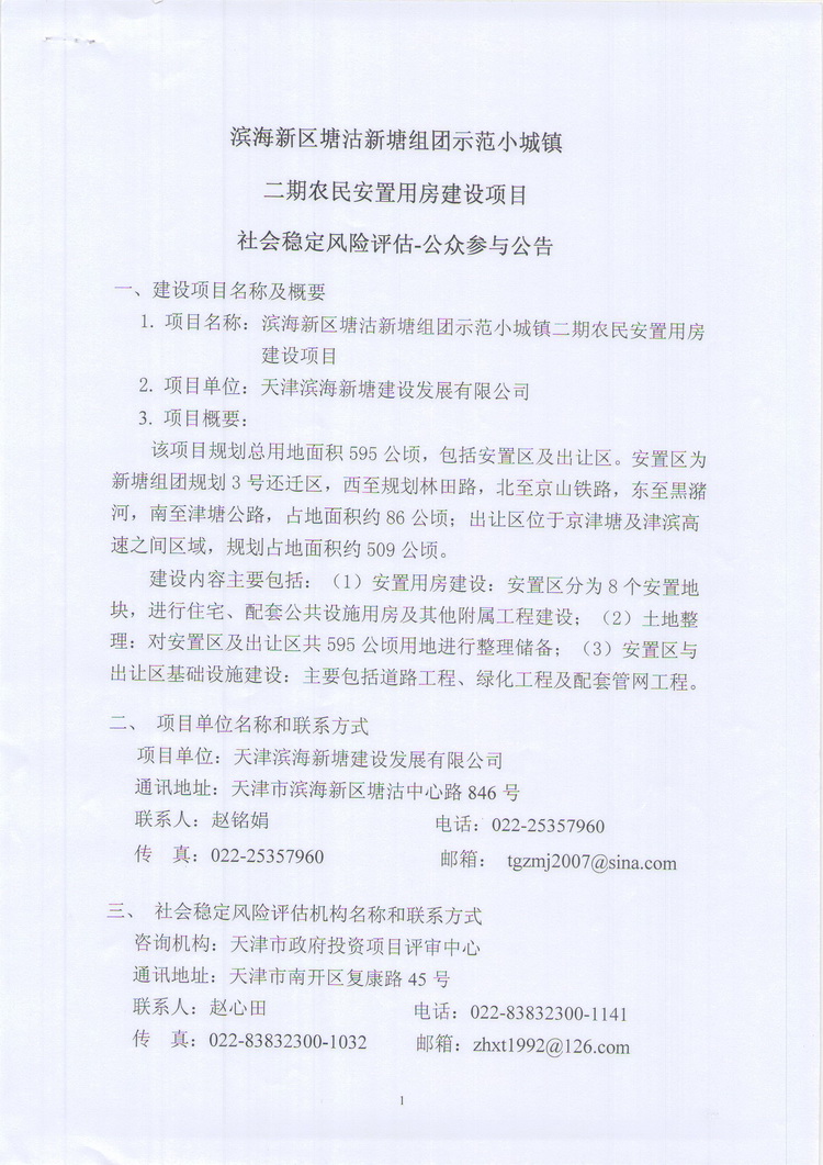 公眾參與公告:濱海新區塘沽新塘組團示范小城鎮二期農民安置用房項目社會穩定風險評估