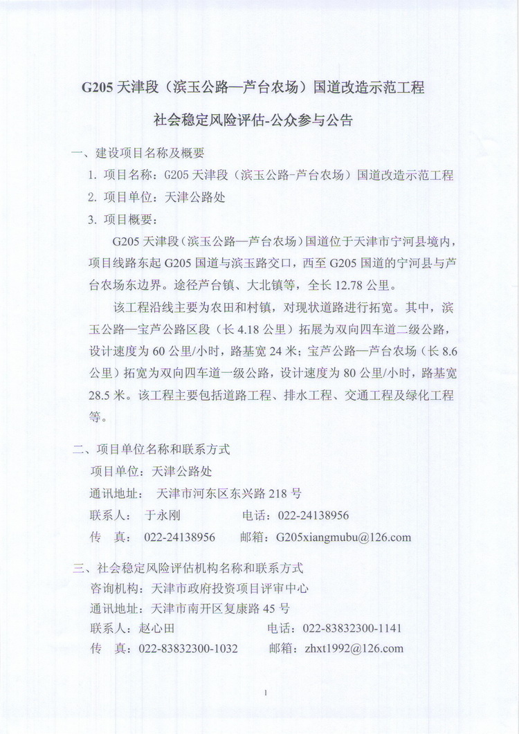 公眾參與公告:G205天津段(濱玉公路-蘆臺農場)國道改造示范工程社會穩定風險評估