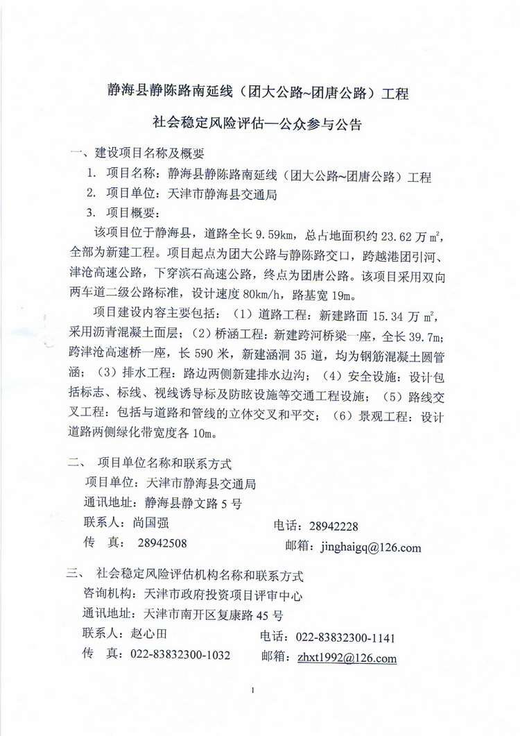 公眾參與公告:靜海縣靜陳路南延線(團大公路—團唐公路)工程項目社會穩定風險評估