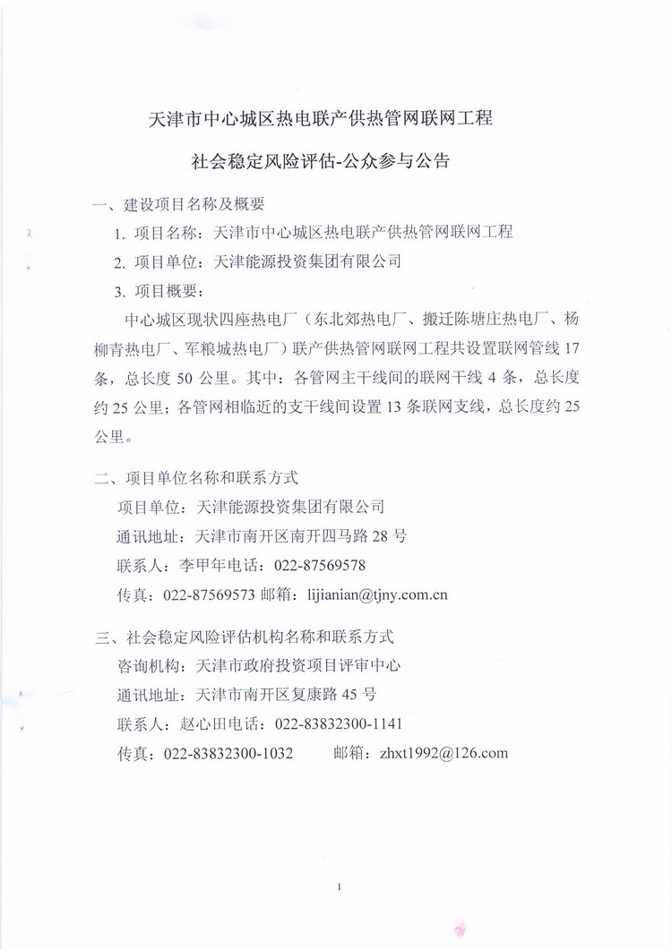 公眾參與公告:天津市中心城區熱電聯產供熱管網聯網工程社會穩定風險評估